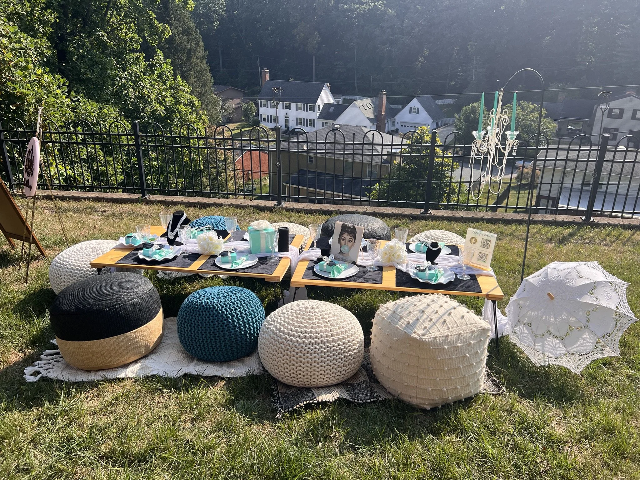 Step in to a chic New York moment inspired by Aubrey Hepburn’s timeless elegance. Styled in robin’s egg blue, accented with crisp whites, and velvet blacks, this theme is perfect for birthdays, bridal showers, anniversaries or simply celebrating in style. This setup brings glamour and comfort for an unforgettable experience.